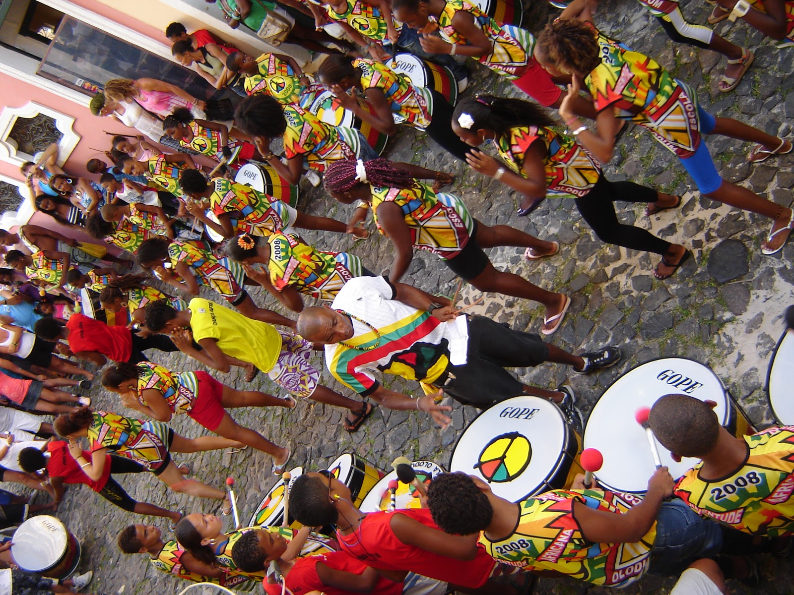 várias ladeiras, é um sobe e vira esquina, e o pessoal batendo tambores sem